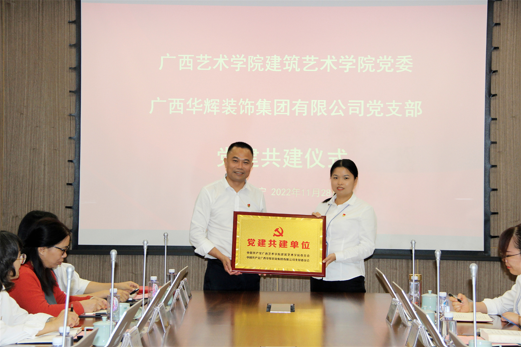 隨后,廣西藝術(shù)學(xué)院建筑藝術(shù)學(xué)院黨委書記馮鳳舉、華輝裝飾集團(tuán)黨支部書記劉萍東簽訂了結(jié)對(duì)共建協(xié)議,并由馮鳳舉同志代表廣西藝術(shù)學(xué)院建筑藝術(shù)學(xué)院黨委向廣西華輝裝飾集團(tuán)有限公司黨支部贈(zèng)牌。