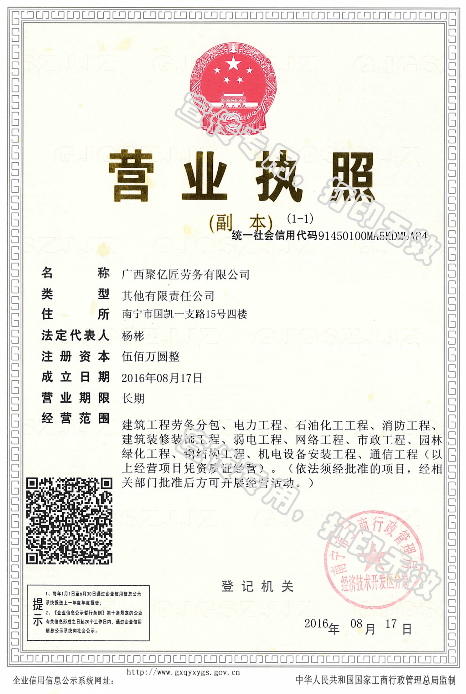 廣西聚億匠勞務(wù)有限公司成立于2016年8月17日,注冊資金500萬元,系華輝集團(tuán)旗下主要從事建筑工程勞務(wù)分包、建筑裝修裝飾工程、電力工程等業(yè)務(wù)的現(xiàn)代企業(yè)。