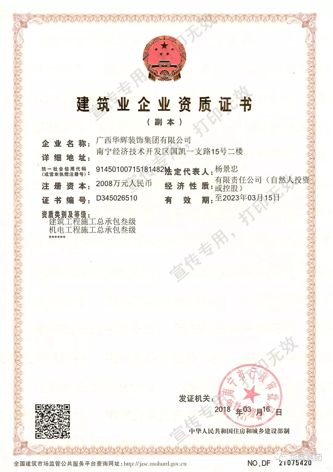 資質(zhì)的取得也是行業(yè)主管部門對(duì)華輝裝飾集團(tuán)工作的認(rèn)可,同時(shí)也是華輝裝飾集團(tuán)對(duì)客戶服務(wù)、打造精品工程的保障。