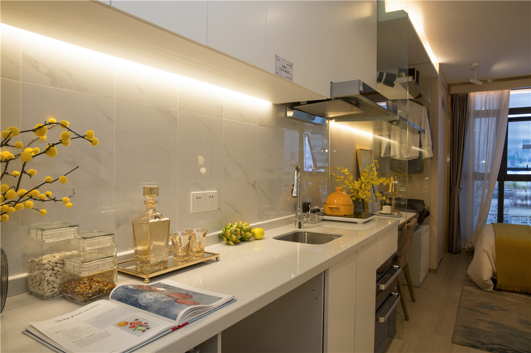 ▲開放式廚房設(shè)計,玄關(guān)與明廚、小客廳連成一線,一字型櫥柜簡潔實用,將擁擠雜亂擠出門外,整體視覺上舒適大氣。