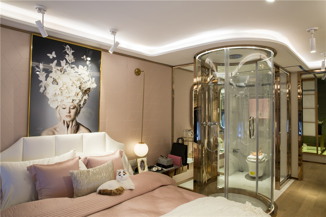 ▲透明的玻璃浴室營造出開闊的空間感,使得室內(nèi)更加寬敞明亮。