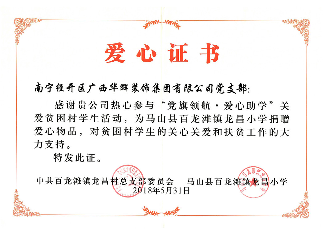 ▲龍昌小學(xué)贈(zèng)予華輝集團(tuán)的愛(ài)心證書(shū)