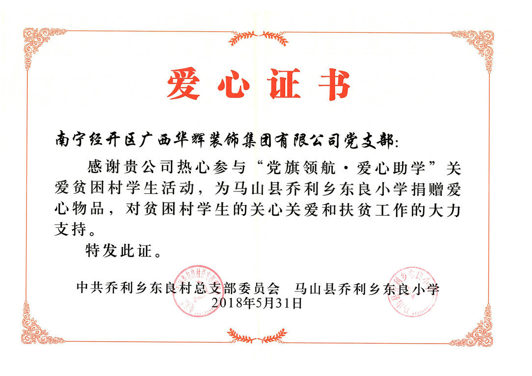 ▲東良小學(xué)贈(zèng)予華輝集團(tuán)的愛(ài)心證書(shū)