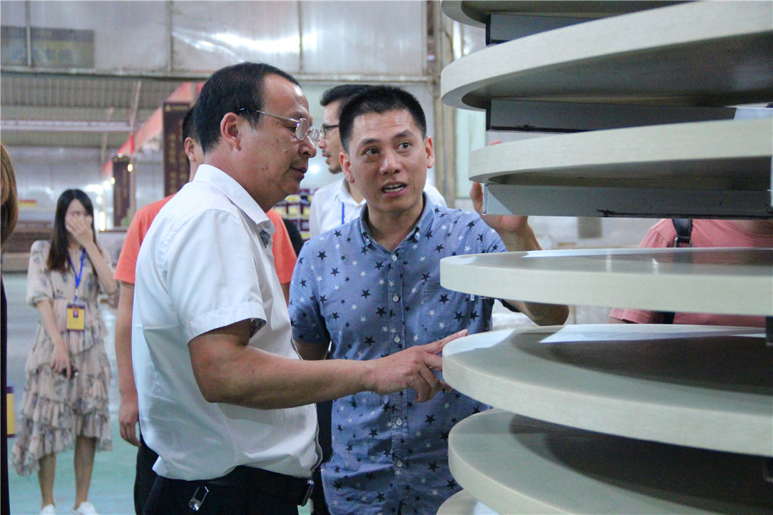 ▲袁繼秋董事長(zhǎng)向華輝工藝主任時(shí)世義了解生產(chǎn)工藝