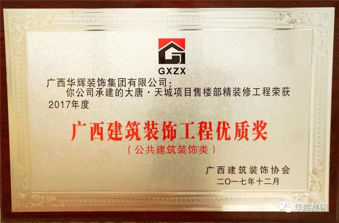 ▲3月29日,廣西建筑裝飾協(xié)會第六次會員代表大會暨表彰大會上,華輝裝飾集團(tuán)喜獲多個獎項(xiàng):“2017年度廣西建筑裝飾工程優(yōu)質(zhì)獎(公共建筑裝飾類)”,“2016年度廣西建筑裝飾行業(yè)先進(jìn)企業(yè)”,“2016年度廣西建筑裝飾行業(yè)優(yōu)秀企業(yè)經(jīng)理”及“2016年度廣西建筑裝飾行業(yè)優(yōu)秀建筑裝飾設(shè)計師”
