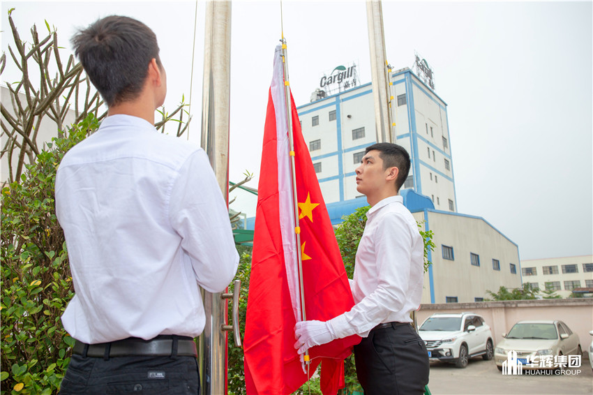 “起來,不愿做奴隸的人們”國歌雄壯奏響,鮮紅的五星紅旗冉冉升起,飄揚在華輝集團上空。華輝司旗、大景司旗緊跟國旗之后冉冉升起。
