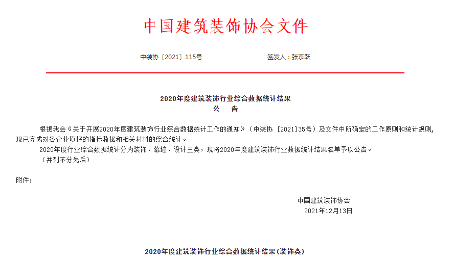 “中國(guó)建筑裝飾行業(yè)綜合數(shù)據(jù)統(tǒng)計(jì)工作”是由中國(guó)建筑裝飾協(xié)會(huì)主辦,采用市場(chǎng)評(píng)價(jià)的方式,通過嚴(yán)格審查參評(píng)企業(yè)年度的各項(xiàng)數(shù)據(jù),測(cè)評(píng)企業(yè)財(cái)務(wù)年度指標(biāo)、質(zhì)量技術(shù)指標(biāo)、人力資源指標(biāo),企業(yè)年度各類工程的獲獎(jiǎng)情況,專利情況,嚴(yán)格參照國(guó)家標(biāo)準(zhǔn)、行業(yè)標(biāo)準(zhǔn)、地方標(biāo)準(zhǔn)進(jìn)行層層測(cè)評(píng),分為裝飾類、幕墻類、設(shè)計(jì)類三項(xiàng),受到業(yè)界的廣泛認(rèn)可。