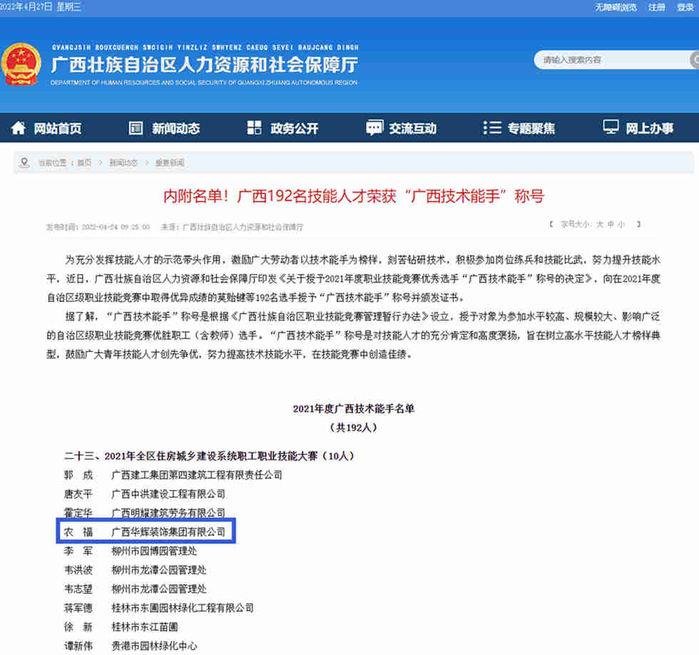 近日,廣西壯族自治區(qū)人力資源和社會(huì)保障廳印發(fā)《關(guān)于授予2021年度職業(yè)技能競(jìng)賽優(yōu)秀選手“廣西技術(shù)能手”稱號(hào)的決定》,華輝集團(tuán)農(nóng)福同志被授予“廣西技術(shù)能手”稱號(hào)。
