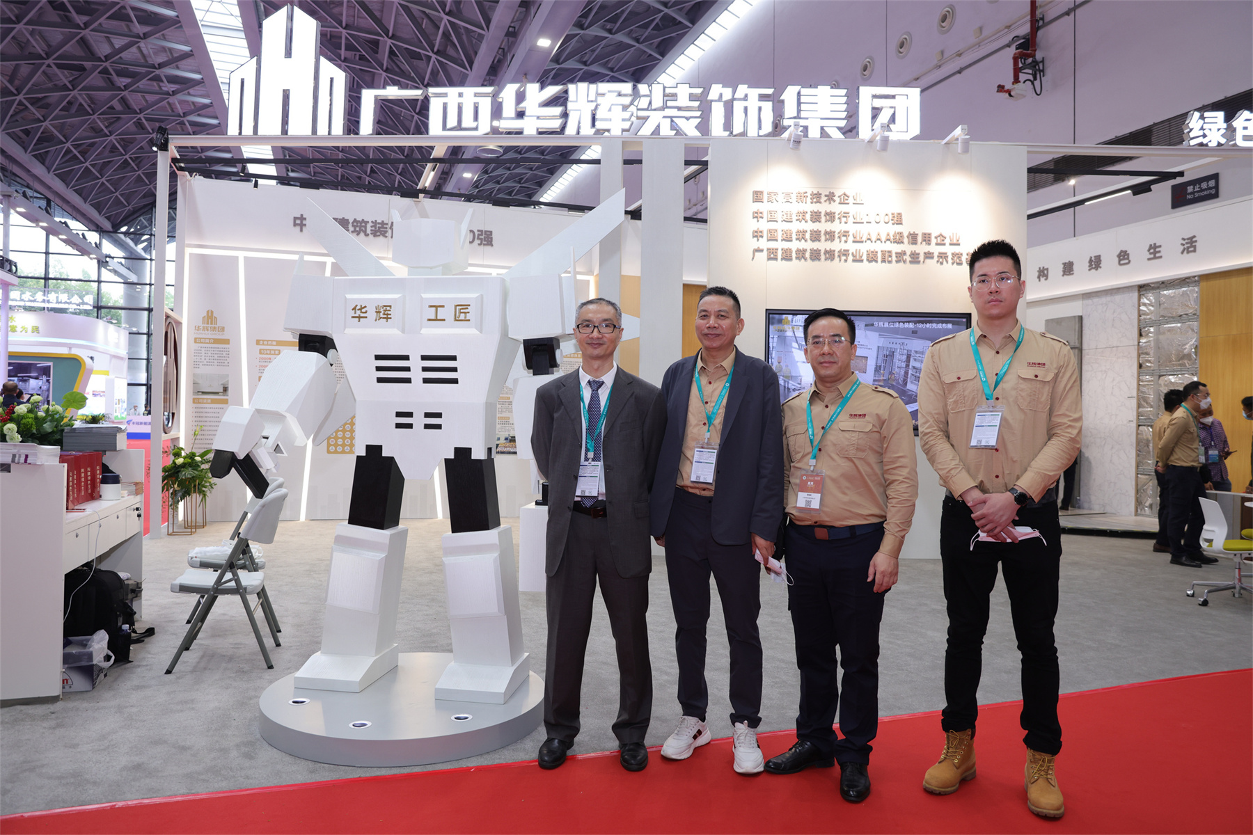 由華輝裝配式工廠出品的“華輝工匠”機(jī)器人,成為展會(huì)現(xiàn)場(chǎng)網(wǎng)紅打卡熱點(diǎn)?!叭A輝工匠”左手提工具箱,右手持釘槍,威武屹立,展現(xiàn)嚴(yán)謹(jǐn)專業(yè)、精益求精的工匠形象。