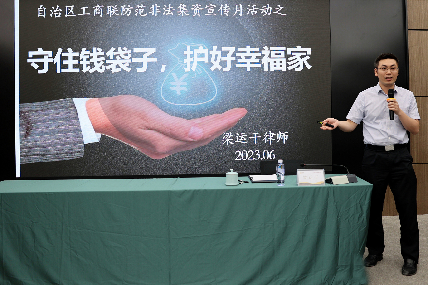活動圍繞“美好生活·民法典相伴”“優(yōu)化法治化營商環(huán)境”“守住錢袋子·護好幸福家”等主題開展民法典、廣西優(yōu)化營商環(huán)境條例和防范非法集資普法宣傳,進一步提升工商聯(lián)所屬商會依法辦事能力和法律服務(wù)水平,提高民營企業(yè)誠信廉潔守法合規(guī)經(jīng)營和法律風(fēng)險防范意識,一體推進法治民企、誠信民企和清廉民企建設(shè)。