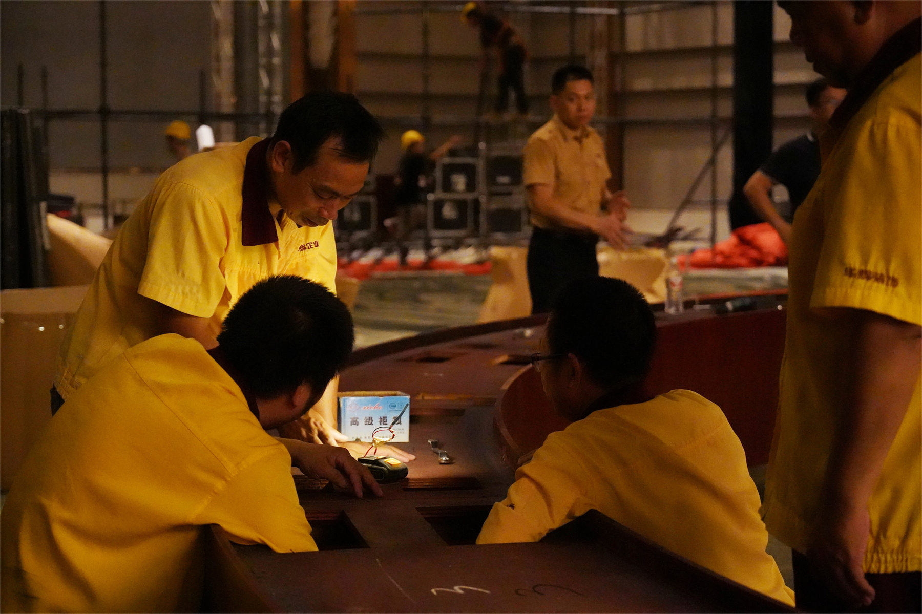 接到任務(wù)后,華輝深感使命光榮、責(zé)任重大。大圓桌直徑12米,周長37.69米,超大型的弧形結(jié)構(gòu)增加了生產(chǎn)難度,且工期非常緊張。為有效縮短工期,華輝采用工廠工業(yè)化部品部件,將超大型的弧形結(jié)構(gòu)逐一分解,拆分工藝、結(jié)構(gòu)和形體。