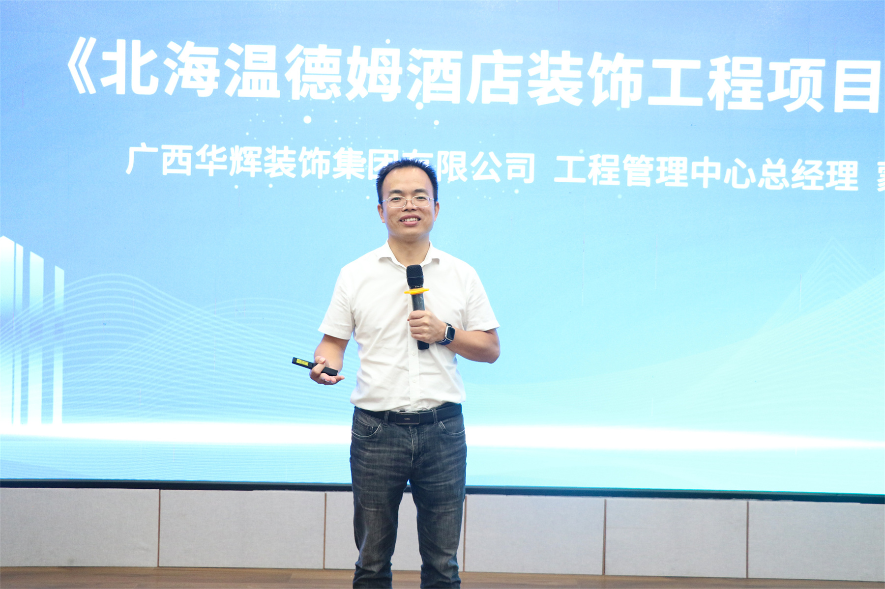 ▲華輝裝飾工程管理中心總經(jīng)理蒙健生作主題為“北海溫德姆酒店裝飾工程”的項(xiàng)目分享