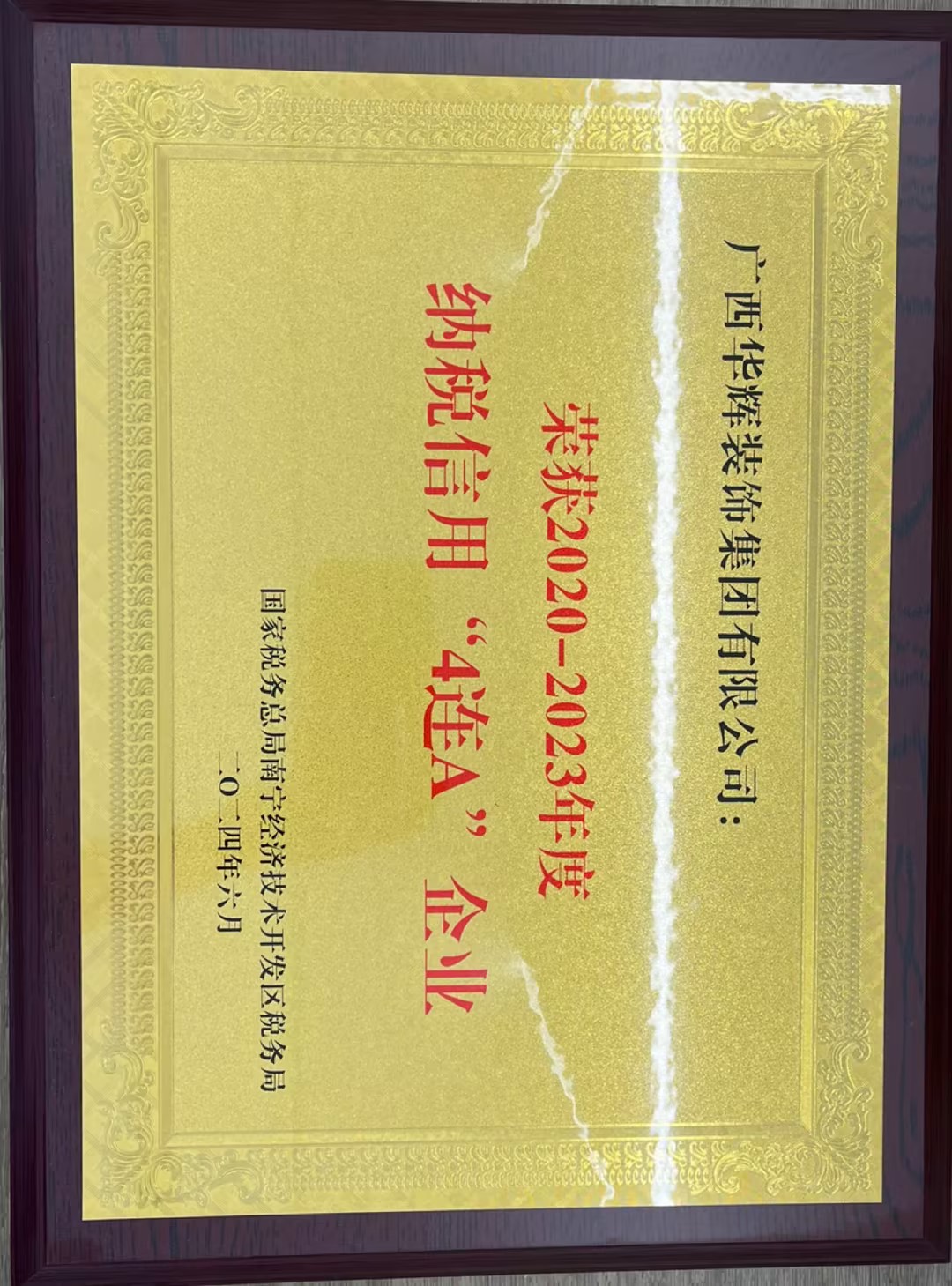 近日,廣西華輝裝飾集團(tuán)憑借良好的納稅信譽(yù),獲得國家稅務(wù)總局南寧經(jīng)濟(jì)技術(shù)開發(fā)區(qū)稅務(wù)局2020-2023年度納稅信用“4連A企業(yè)”榮譽(yù)稱號。
