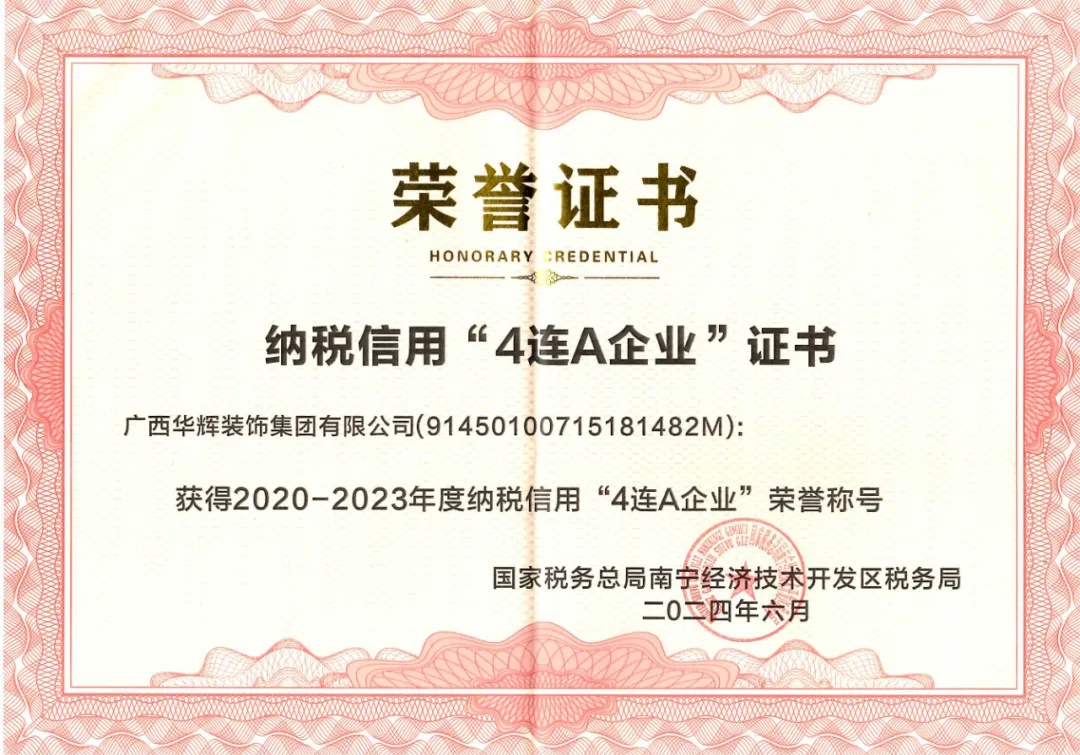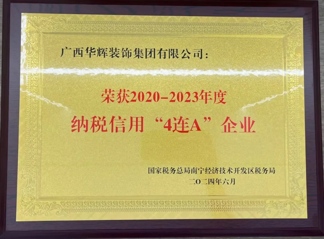 近日,廣西華輝裝飾集團憑借良好的納稅信譽,獲得國家稅務(wù)總局南寧經(jīng)濟技術(shù)開發(fā)區(qū)稅務(wù)局2020-2023年度納稅信用“4連A企業(yè)”榮譽稱號。