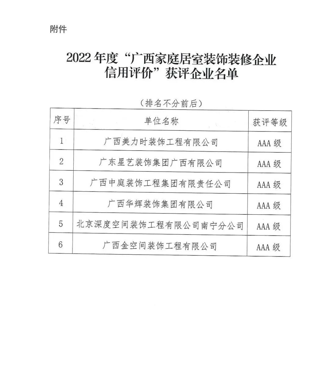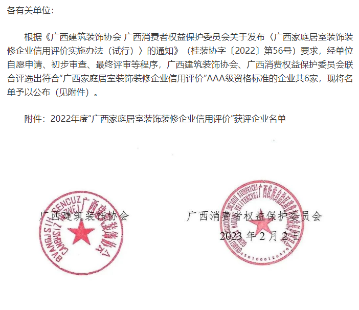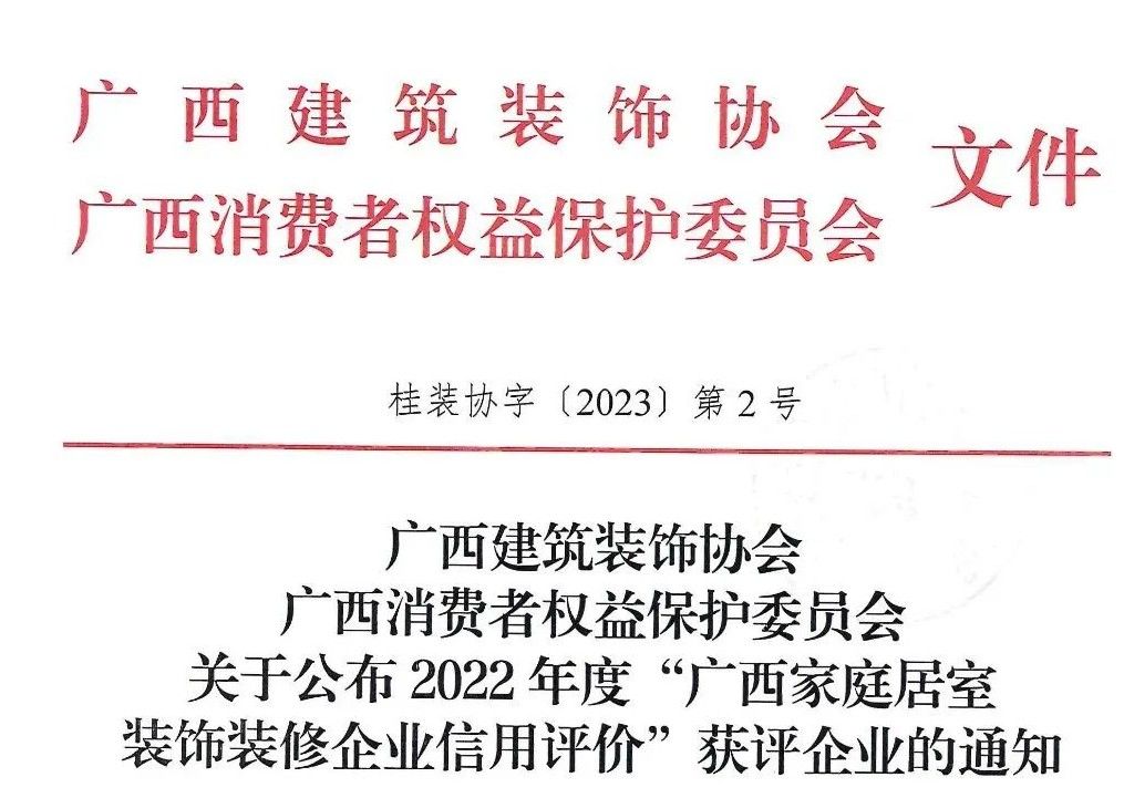 2023年2月2日,廣西建筑裝飾協(xié)會、廣西消費者權(quán)益保護委員會聯(lián)合發(fā)布通知,評選出符合“廣西家庭居室裝飾裝修企業(yè)信用評價”AAA級資格標(biāo)準(zhǔn)的企業(yè)共6家,廣西華輝裝飾集團有限公司為獲評企業(yè)之一。